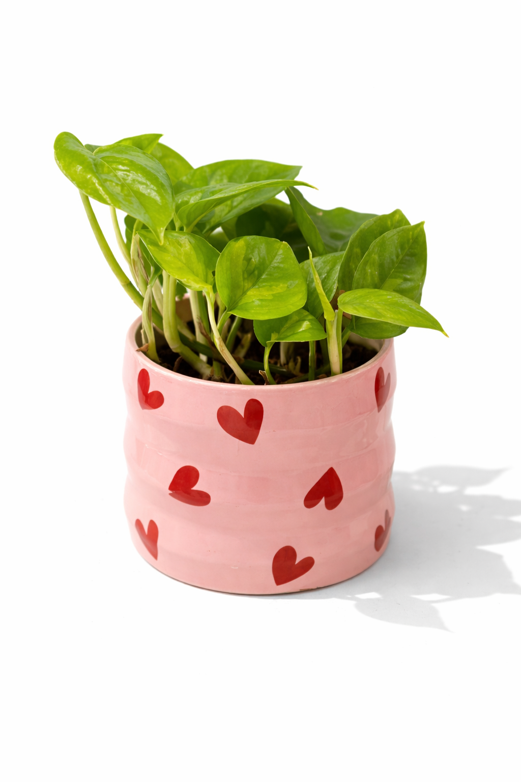 Πόθος σε ροζ κεραμικό κασπώ με καρδιές. Ένα γλυκό, ζωντανό δώρο για τον Άγιο Βαλεντίνο που μένει στον χρόνο.