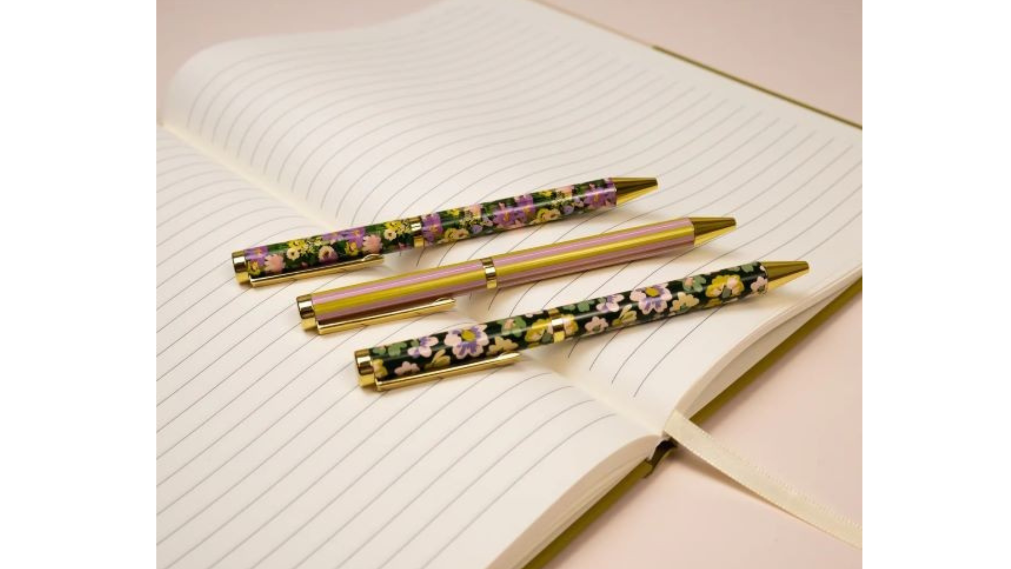 Σετ 3 κομψών στυλό σε floral και ριγέ σχέδια με χρυσές λεπτομέρειες, μέσα σε πολυτελή συσκευασία δώρου. Ιδανικό για να δώσει στυλ στη γραφή σας και να αποτελέσει ξεχωριστό δώρο.