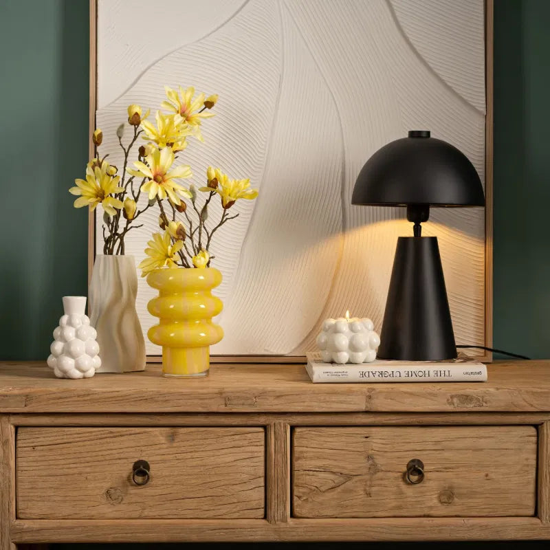 Γυάλινο βάζο σε έντονη κίτρινη απόχρωση με κυματιστό, στρογγυλεμένο σχέδιο. Το παιχνιδιάρικο σχήμα και οι διακριτικές διαφάνειες του γυαλιού δημιουργούν ένα ανάλαφρο, φωτεινό αποτέλεσμα που δίνει ζωή σε κάθε χώρο. Ιδανικό για φρέσκα άνθη ή ως αυτόνομο διακοσμητικό αντικείμενο με σύγχρονο χαρακτήρα και ρετρό διάθεση.
